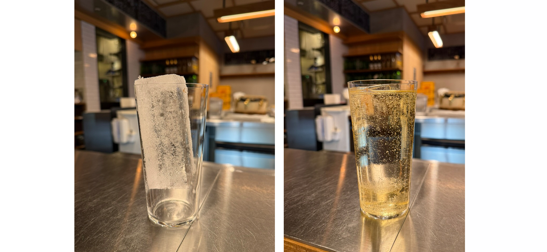 酒場sodaさんでは、「溶けにくいようにマイナス20度で大切に保管し、提供しています。2杯3杯と継ぎ足しても溶けにくく、お客さまにドリンクの味わいを楽しんでいただいています」とのこと。お近くにお越しの際はぜひ、岡本製氷さんのオシャレな純氷でお酒を楽しんでください。