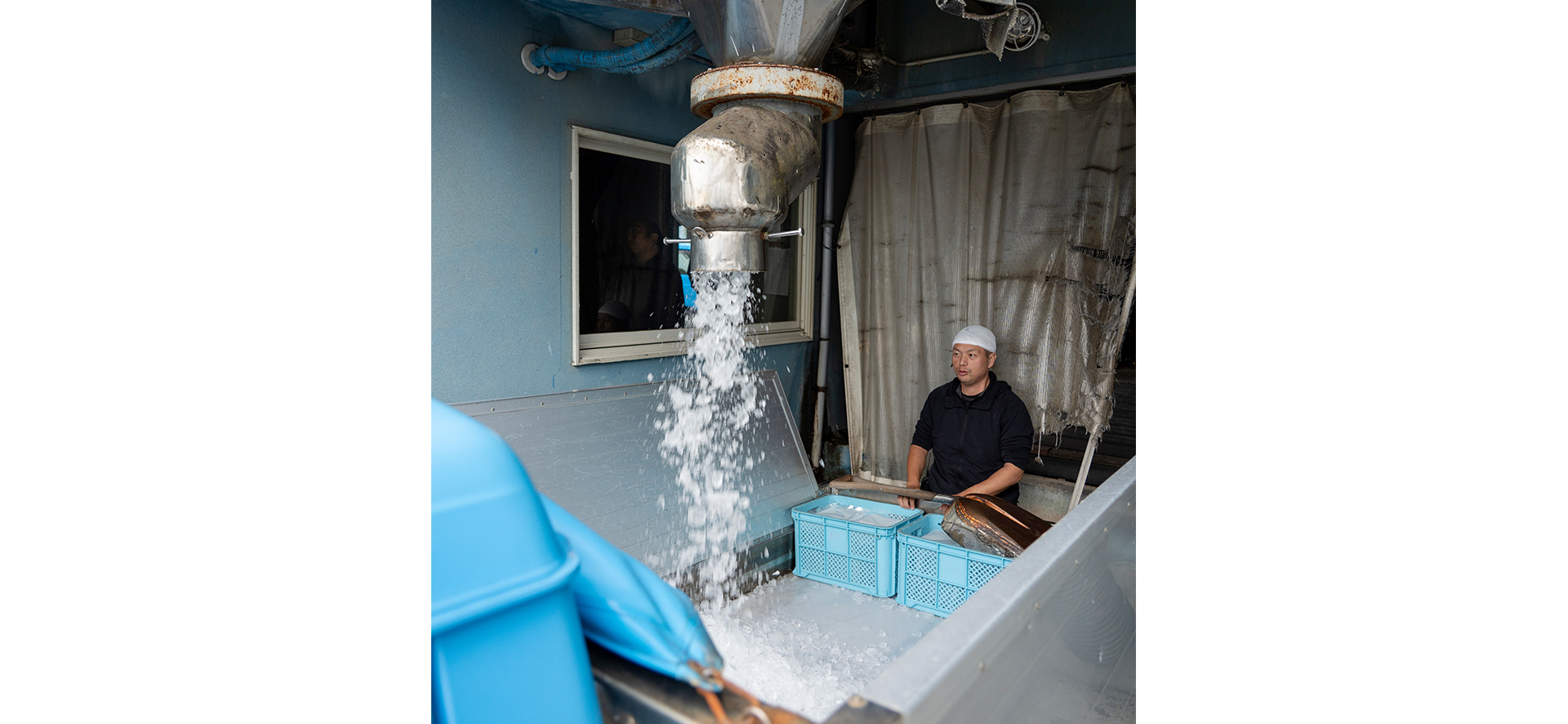 岡本 漁港では、船に氷を積んで沖に出て、水揚げする前に鮮度が落ちないようにタンクに氷をはって冷やして。仲買人さんが魚を買い付けて工場に持っていき、発泡スチロールに詰めてまた氷を入れて出荷してと、水揚げする前から出荷まで氷が登場するシーンは多いですね。やはり鮮度保持という役割で、氷の必要性は常にあります。