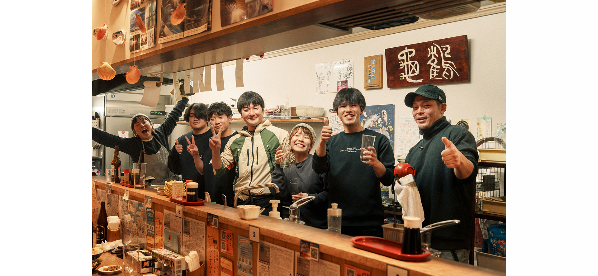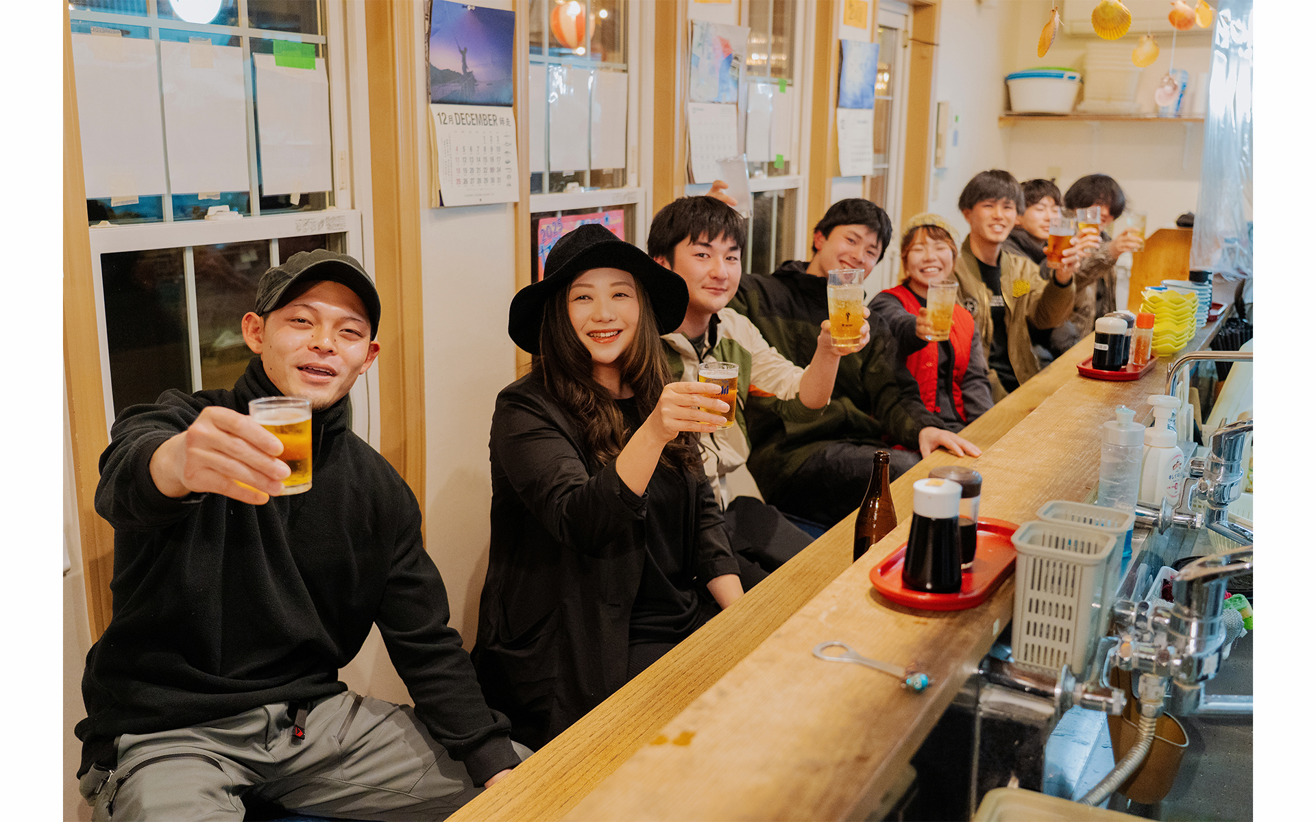 2025年12月某日、気仙沼魚市場前の横丁で、若手漁師さんが隔月開催しているという居酒屋を覗いてきました。この日参加した漁師さんはお手伝い含む7人。気仙沼出身、他県からの移住者など、さまざまな経歴の若手漁師さんの熱気に、心地よく酔ってしまいます。