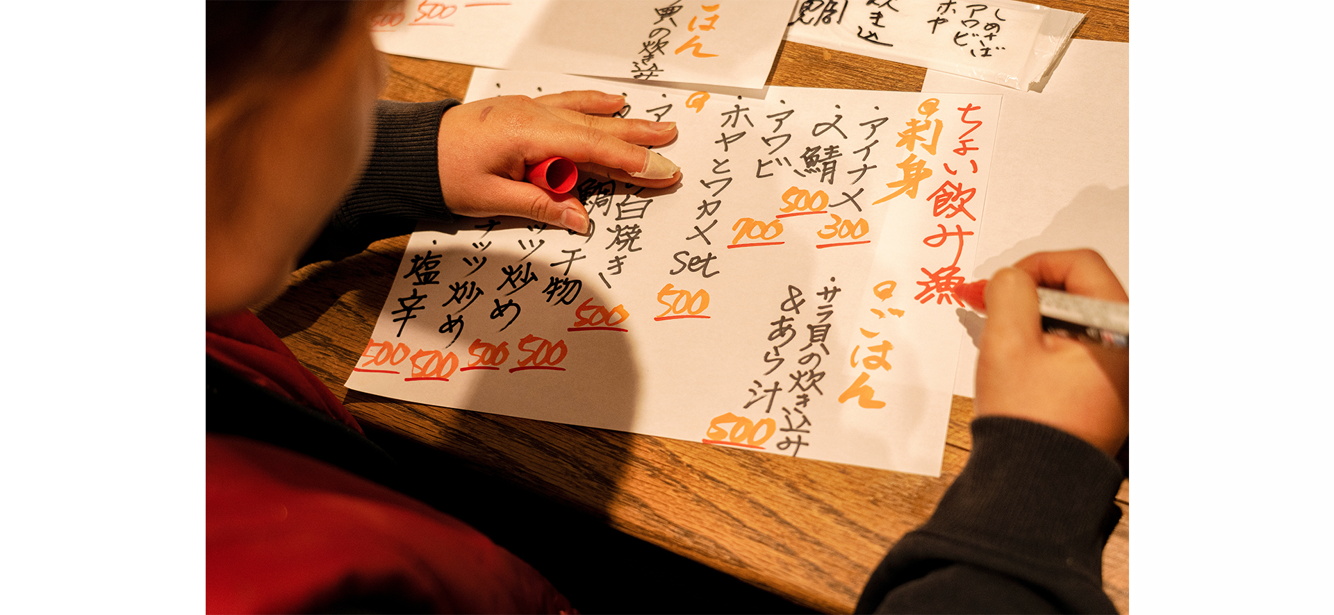 メニューは持ち込んだ漁師さんが決めるのので、「もうすぐ開店するよ」というタイミングでも、まだメニューの下書きをしていて、「値段もどうする?」ってその場で相談。わちゃわちゃしてる間に、予定の18時をほんの少し過ぎて、ようやく開店しました。
